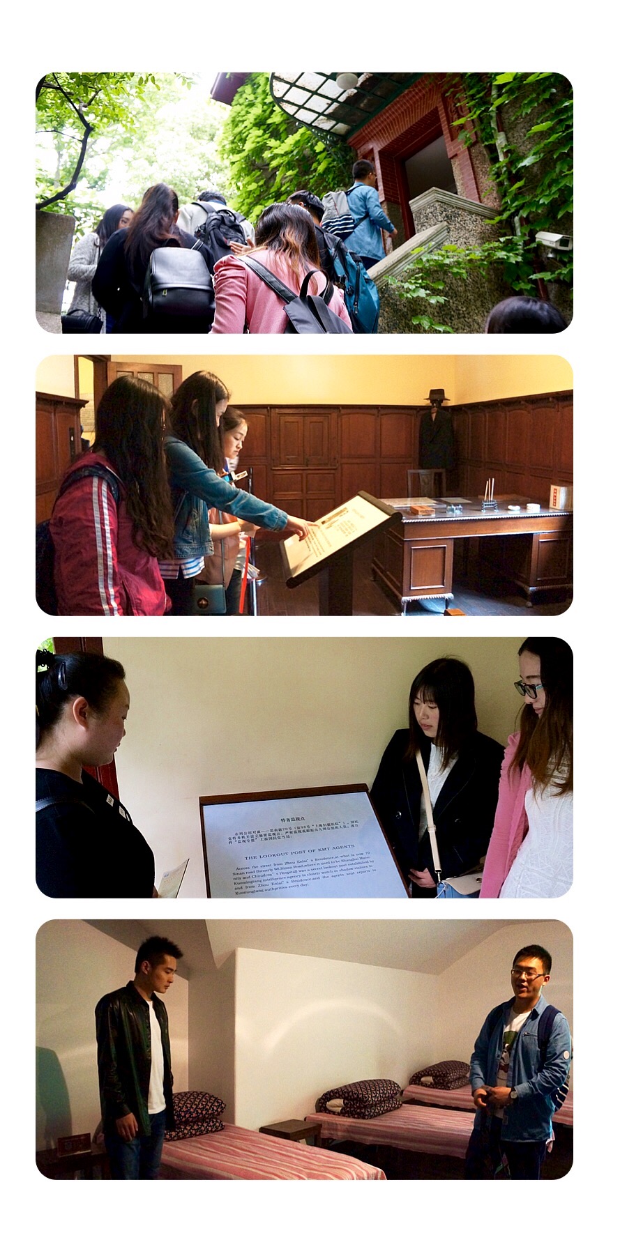 在周公馆,大家目睹伟人故居简陋的陈设,聆听讲解员娓娓道来的历史故事,对当时在艰苦恶劣的环境下,仍坚持为祖国的强盛和人民的幸福不懈奋斗的先辈们以及周恩来、董必武等老一辈无产阶级革命家的钦佩之情油然而生,同时也受到了他们感人事迹所带来的强烈的心灵冲击。那朴实的书桌,简单得不能再简单的宿舍和床铺,还有在当时被视为战斗武器的油印机,这些物品仿佛无声的向参观者娓娓道来当年的峥嵘岁月,也更加坚定我们做一名优秀合格党员的决心!