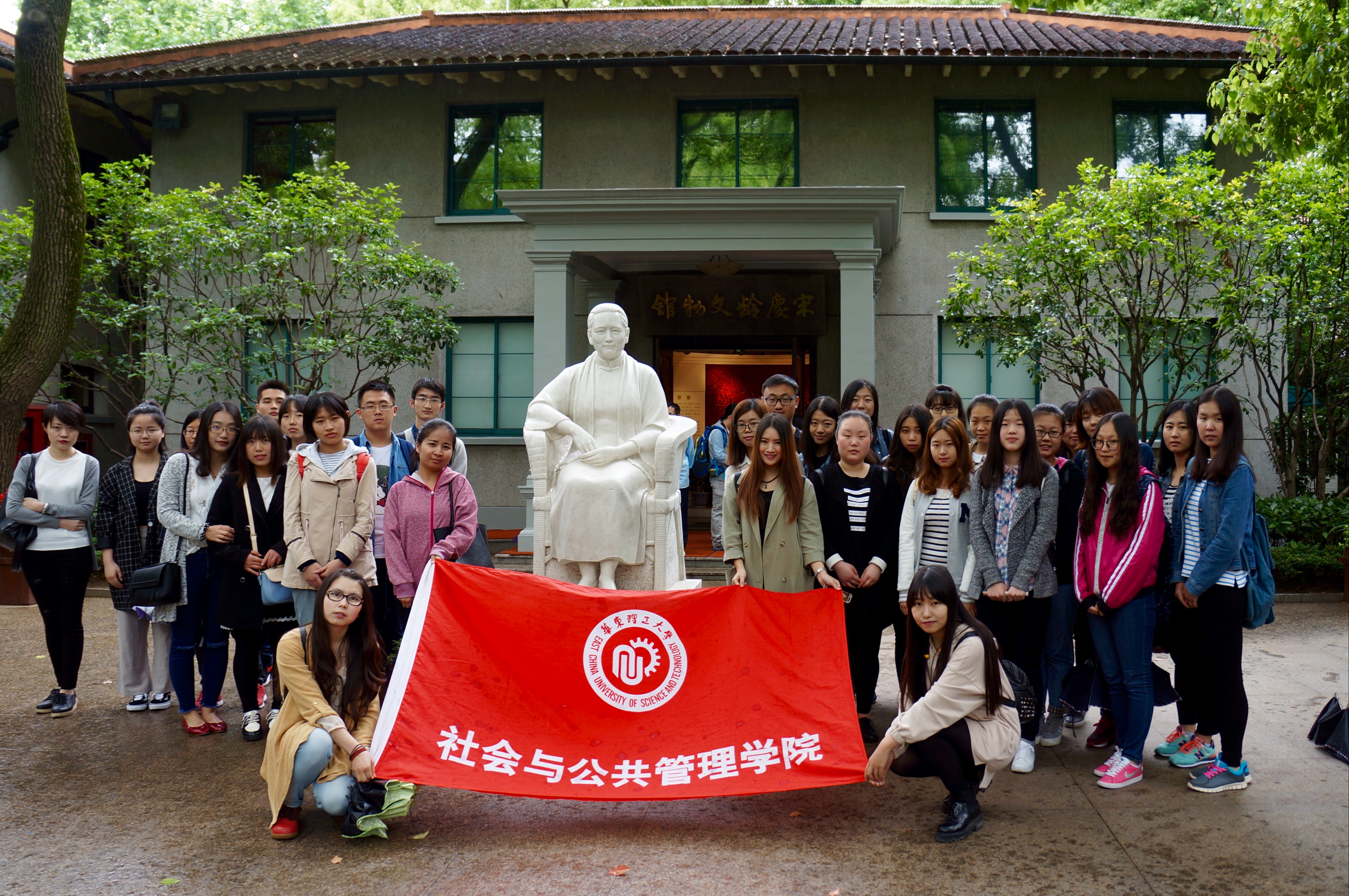 宋庆龄故居四周樟树环绕,终年葱茏苍翠,环境优雅宁静。映入眼帘的是汉白玉雕刻的宋庆龄雕像,端庄慈祥,再想到先生倾其一生为祖国所做出的巨大贡献,敬佩之情油然而生。故居包括纪念广场、文物馆、主楼、花园和专题展厅等五个部分。身处宋庆龄生前生活和从事国务活动的重要场所当中,漫步其间,似乎仍能感受到伟人的音容笑貌和不朽风范,让我们真切感受到了她在长达七十年多年的革命生涯中坚强不屈、英勇奋斗的精神,并为祖国人民的解放事业、为祖国的统一和为保卫世界和平做出了不可磨灭的贡献。在参观的过程中,社会学院的党员师生们频频放缓脚步,仔细观察和聆听,用心去感悟宋庆龄先生伟大一生的事迹和贡献.