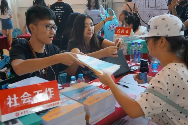 新生们拿着相关证件到自己所在的学院登记处进行新生报到和注册,完成报到的第一步。
