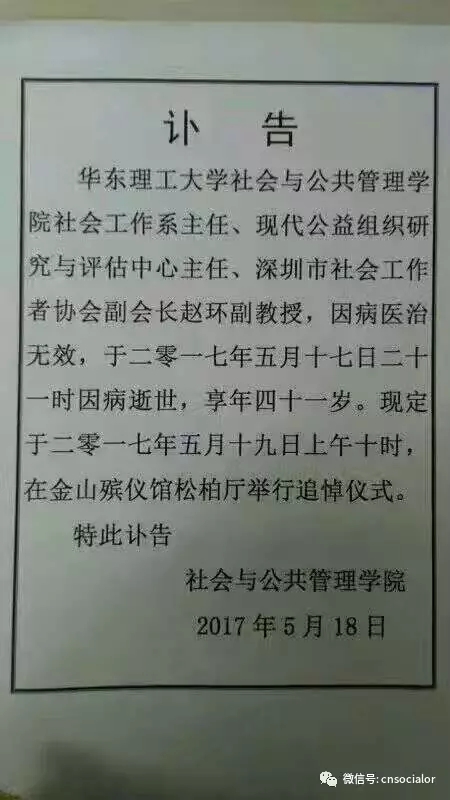 必赢76net线路官网社会工作系系主任、现代公益组织研究与评估中心主任、深圳市社会工作者协会副会长赵环副教授,因病医治无效,于二零一七年五月十七日二十一时因病逝世,享年四十一岁。现定于二零一七年五月十九日上午十时,在金山殡仪馆松柏厅举行追悼仪式。