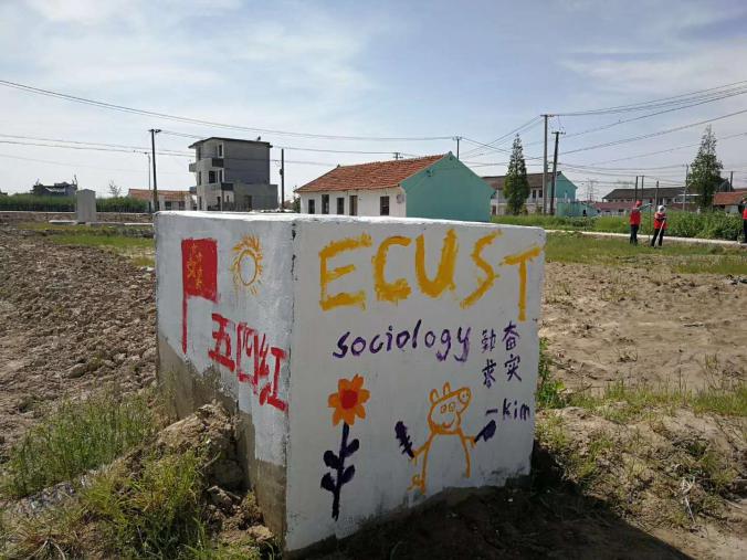 下午,师生们兵分两路,一部分人留下与五四村的青年党员共同劳作,参与到“和美宅基”的建设中,并在五四村的水泥墩子上留下了华理社会学永恒的印记。