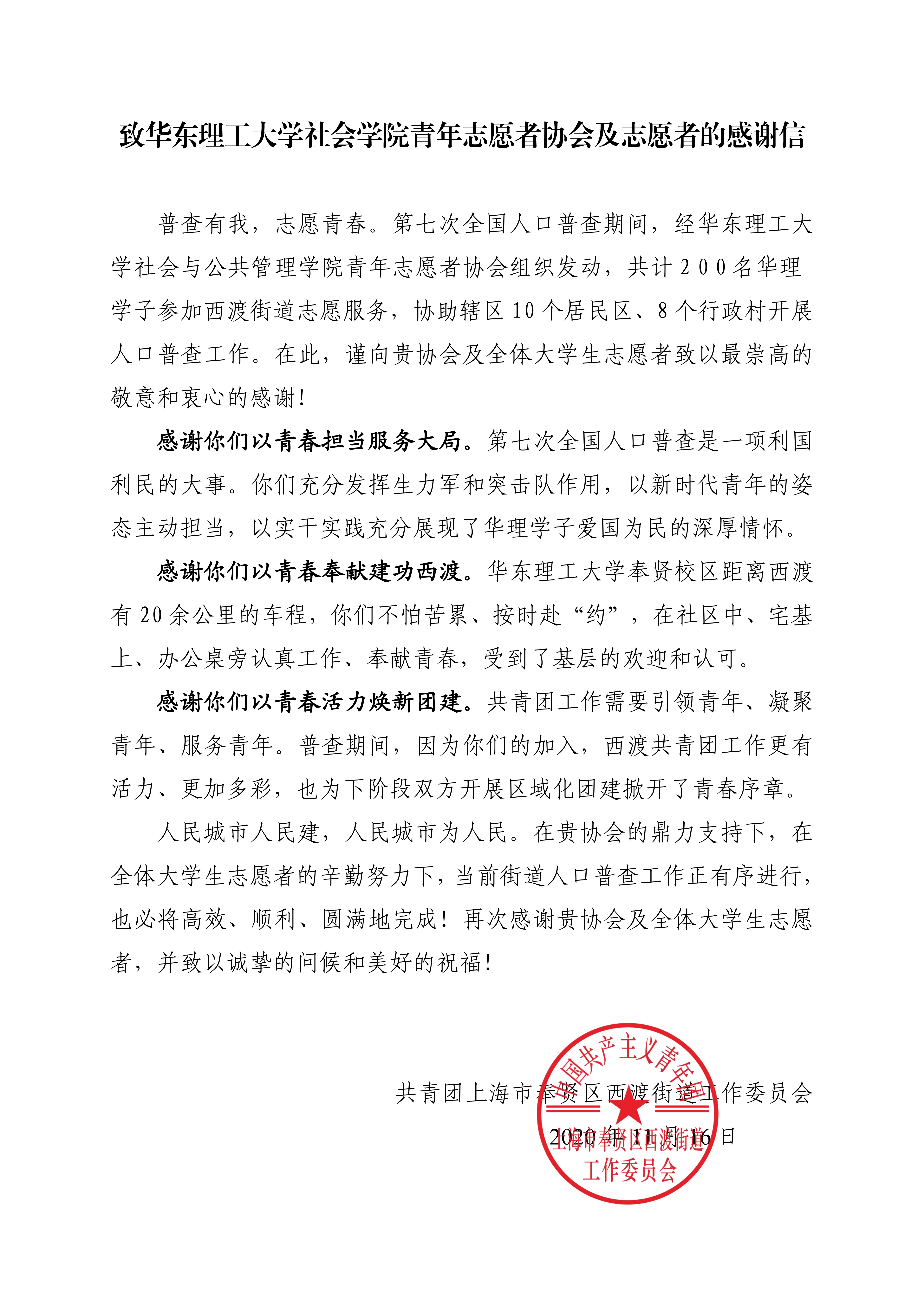 日前,第七次全国人口普查工作已经进入尾声,社院志愿者在工作中表现出的认真负责,勤恳踏实,得到了相关街道团委,居委办事处的高度评价,西渡街道团工委,金汇镇金聚居委,金汇镇金贤居委等组织,都以书面形式,向为人口普查工作圆满完成付出努力的社院志愿者们,表达感谢。