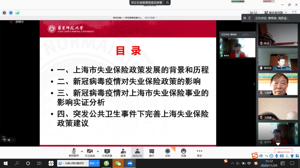华东师范大学必赢76net线路官网曹艳春副教授做了题为“新冠病毒疫情对上海失业保险发展的影响及其对策研究”的学术报告。第一部分是上海市失业保险政策发展的背景和历程。第二部分从个人与企业的角度说明新冠病毒疫情对失业保险政策内容的影响。第三部分从参加失业保险情况和新冠病毒疫情对失业保险的影响做新冠病毒疫情对上海市失业保险事业的影响实证分析。第四部分是突发公共卫生事件下完善失业保险政策建议,主要包括控制疫情对失业保险失业的影响、建立健全常态化失业预警机制、建立资源整合型公共就业服务机构、后疫情时代要充分发挥新岗位的潜力以及创新适宜新型灵活就业的劳动关系。