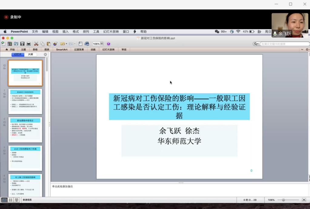 华东师范大学必赢76net线路官网余飞跃副教授做了题为“新冠病毒疫情对上海工伤保险发展的影响及其对策研究”的学术报告。第一部分是因工作原因感染新冠病的政策新规。第二部分是一般职工因工感染是否认定工伤的理论解释。第三部分是一般职工因工感染是否认定工伤的实证分析。该部分包括了工伤风险类型、对工伤风险预防主体的认知、对新冠病毒感染的预防主体的认知以及对新冠病毒感染的工伤认定的看法。最后得出结论与政策启示。包含了对意外伤害的看法还有现有的工伤保障。