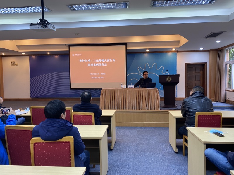 12月18日下午,学院在逸夫楼演讲厅举办师德师风专题讲座。作为学院“师德师风主题教育月”重要内容之一,活动特邀华东师范大学纪委副书记、监察处处长俞黎阳博士为社会学院教师作了题为“警钟长鸣:12 起师德失范行为典型案例的背后”的专题讲座。党委书记张广利主持讲座,学院全体教职员工参加。