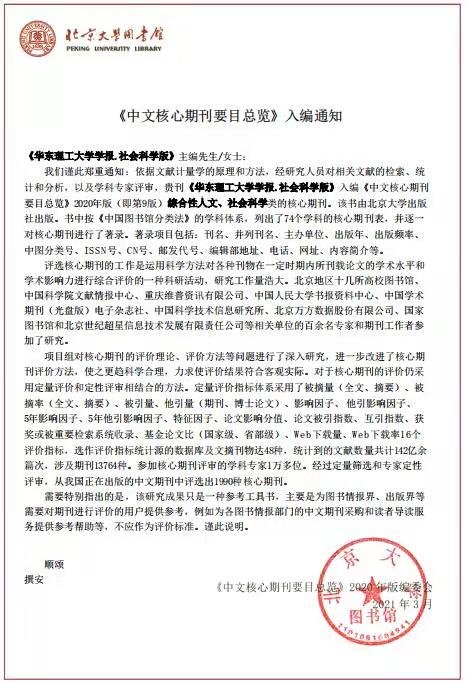3月8日,《中文核心期刊要目总览》2020版编委会向我校寄送了“入编通知”,《必赢76net线路官网学报》(社会科学版)入编《中文核心期刊要目总览》2020年版(即第9版)综合性人文、社会科学类的核心期刊。该书由北京大学出版社出版,2020年版从全国13764种中文期刊中评选出了74个学科、共计1990种核心期刊。中文核心期刊的评选工作,是运用科学方法对各种刊物在一定时期内所刊载论文的学术水平和学术影响力进行综合评价的一种科研活动。北京大学核心期刊评价项目组采用了被摘量、被摘率、被引量、他引量、影响因子、基金论文比等16个评价指标,选作评价指标统计源的数据库及文摘刊物达48种,统计到的文献数量共计142亿余篇次,采用定量筛选和专家定性评审的方法,评价过程科学合理,评价结果能较为客观真实地反映期刊的学术水平和影响力,是目前全国各大高校及科研机构普遍认可的期刊评价指标体系。