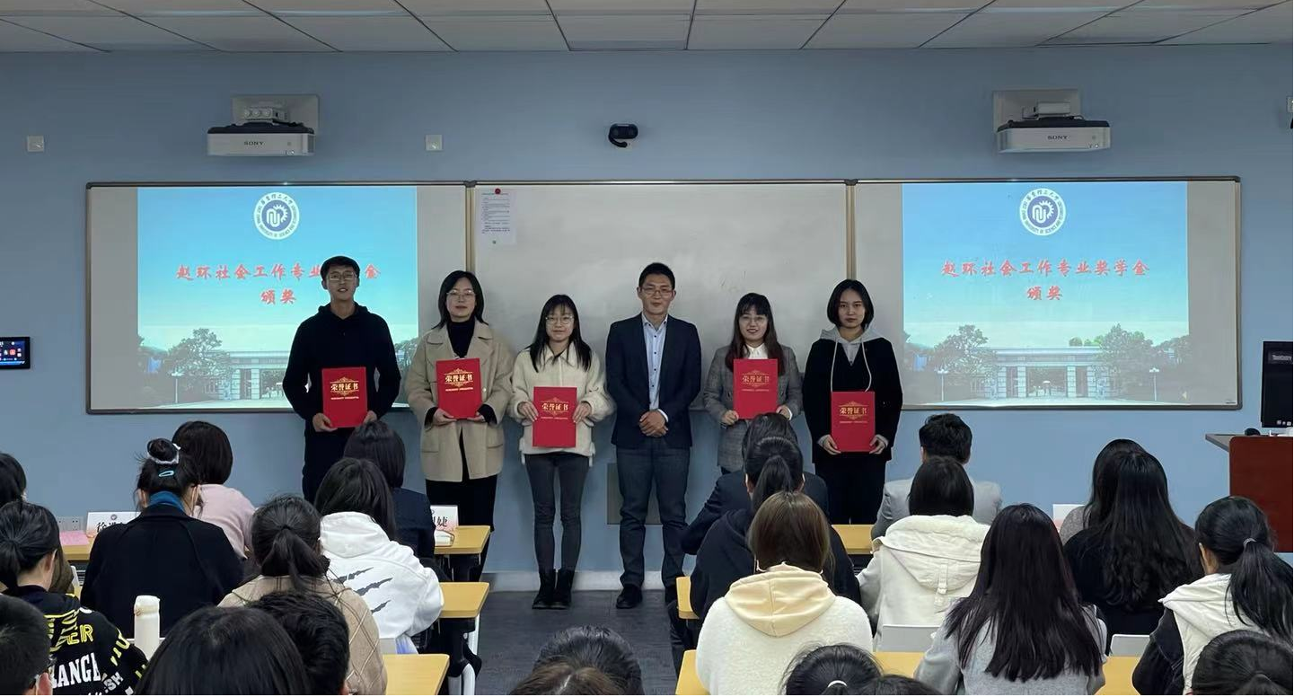 图4 徐选国委员为“赵环社会工作专业奖学金”获得者颁奖