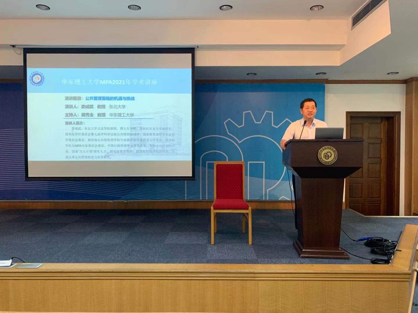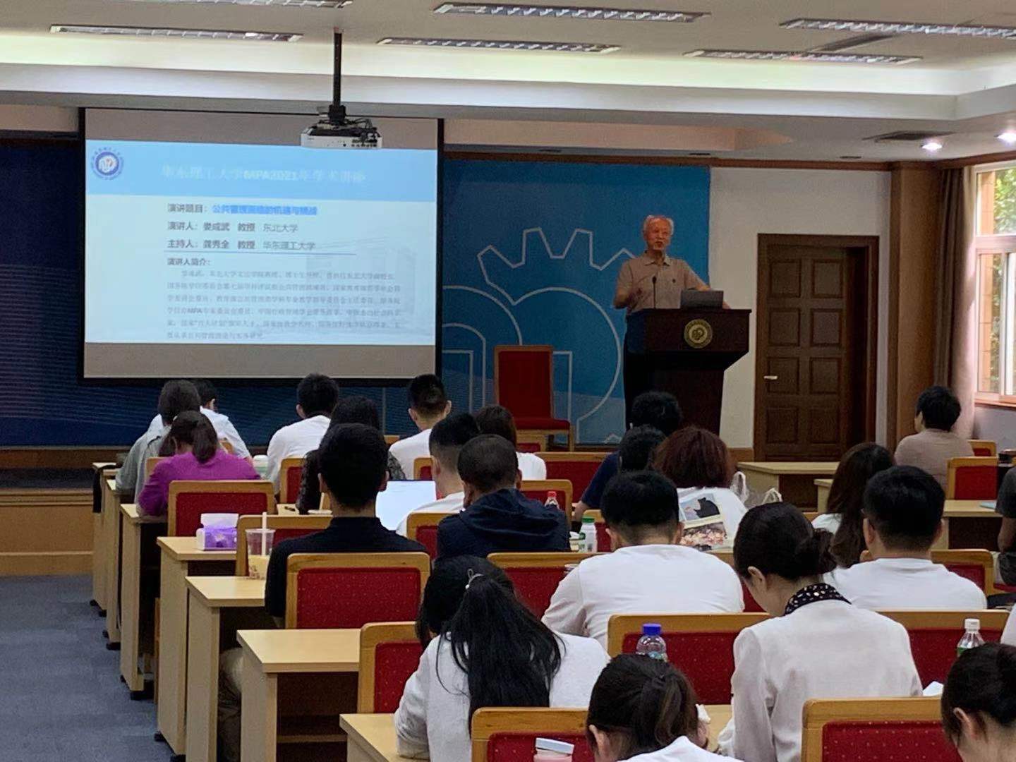5月16日下午,学院特邀东北大学文法学院教授、博士生导师娄成武莅临我院,在徐汇校区逸夫楼一层演讲厅开展了以“公共管理面临的机遇与挑战”为题的讲座。娄成武教授曾担任东北大学副校长、国务院学位委员会第七届学科评议组公共管理组成员、教育部哲学社会科学委员会委员、教育部公共管理类学科专业教学指导委员会主任委员、国务院学位办MPA专家委员会委员、中国行政管理学会常务理事,中国杰出社会科学家,国家级教学名师,国务院特殊津贴获得者,主要从事公共管理理论与实务研究。讲座由学院MPA中心主任龚秀全教授主持,学院师生100余人参加了本次讲座。