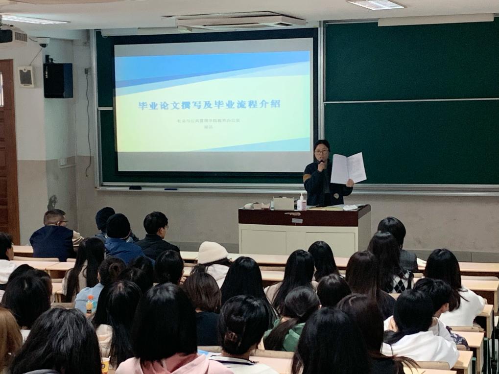 杨洁向毕业生介绍了毕业论文撰写的相关流程和时间节点,叮嘱毕业班学生在繁忙的升学备考和求职就业同时,要守好学业底线,按要求完成毕业论文。