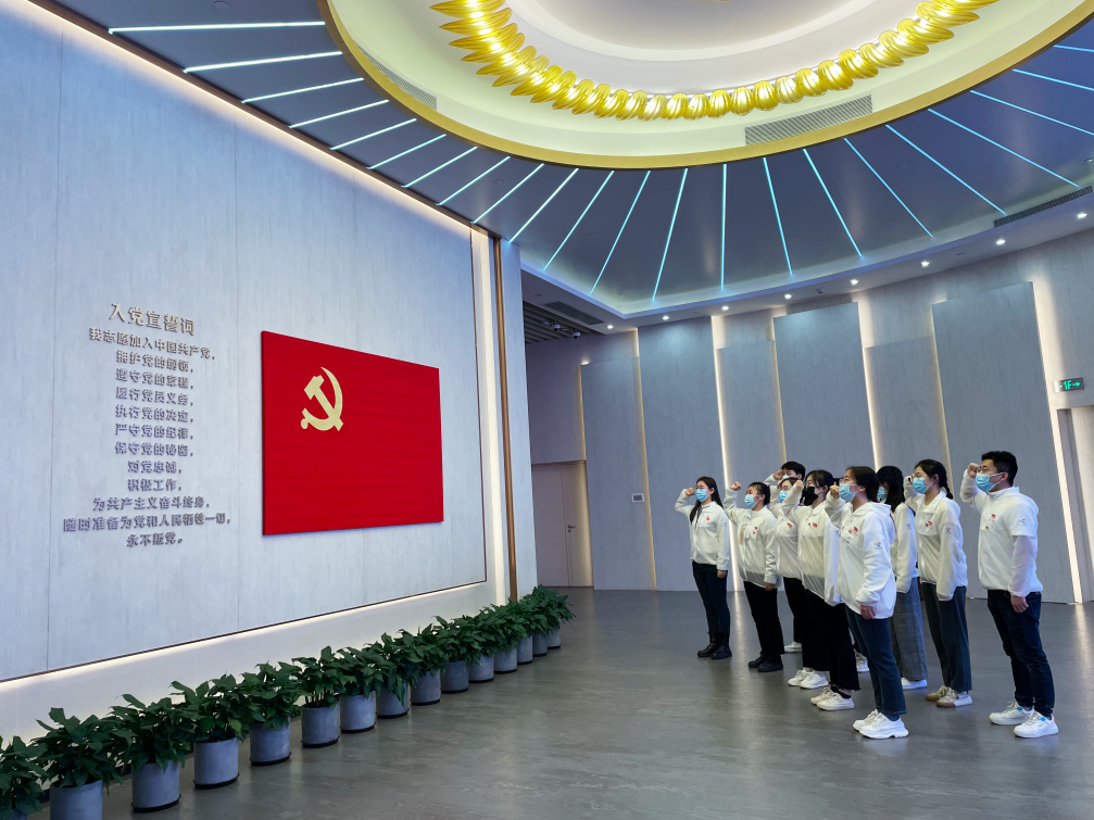 在一天的志愿服务工作结束后,在宣誓厅内中国共产党党旗前,支部党员们一同高举右拳,重温入党誓词。一句句铮铮誓言更加坚定了党员们为人民服务的初心和信念。
