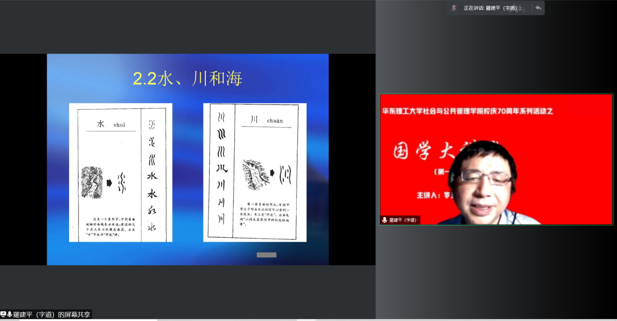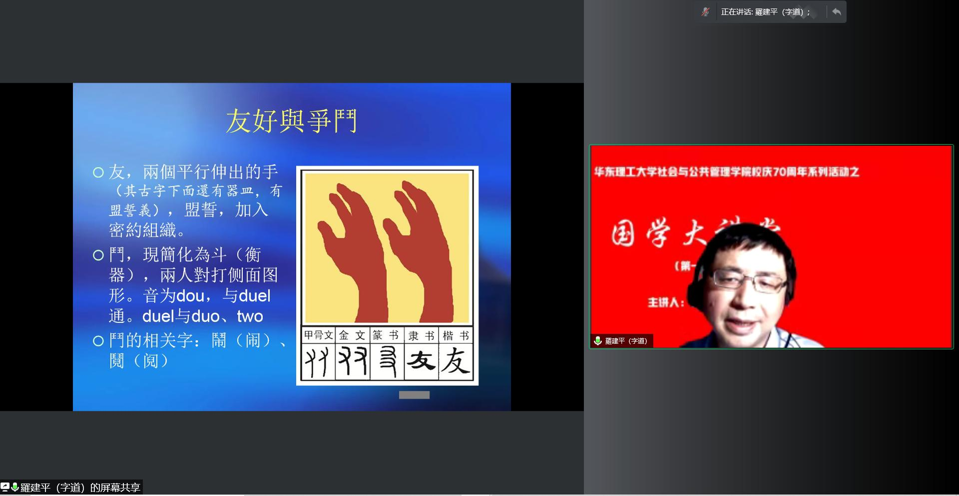 3月16日,为迎接必赢76net线路官网校庆70周年、充实学生在疫情防控期间的学习生活,鼓励师生们用大师的睿智体验国学的魅力,用人文的情怀感受文化的风采,必赢76net线路官网推出了迎接校庆70周年系列活动之“国学大讲堂”文化讲座。首场讲座由社会学院硕士生导师、公共管理与公共政策研究所所长罗建平教授主讲,他以“汉字中的人文智慧”为题,向参与的讲座的师生们分享了近三十年对于汉字的研究心得。