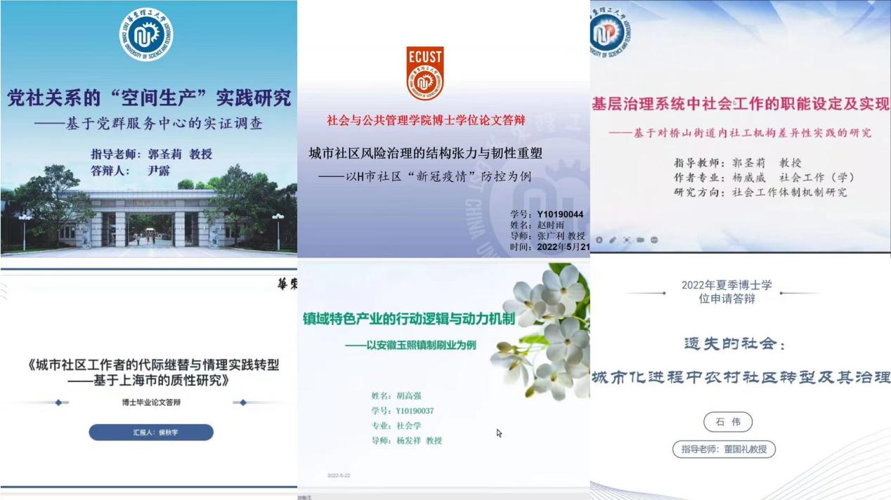 参加答辩的博士生有尹露、赵时雨、杨威威、侯秋宇、胡高强、石伟等分别以《党社关系的“空间生产”实践》《结构张力与韧性重塑:城市社区风险治理研究》《基层治理系统中社会工作的职能设定及实现》《城市社区工作者的代际继替与情理实践转型》《镇域特色产业发展的行动逻辑与动力机制》和《遗失的社会:城市化进程中的农村社区转型及其治理》为题,陈述了博士论文的相关内容,答辩委员逐一就各位博士生的论文进行评议和提问,各位博士生根据答辩委员会专家的提问作了有针对性的问答。接着,答辩委员会召开闭门讨论,形成了针对各学位申请人的答辩决议,并通过问卷星进行了无记名投票。6位答辩人均全票通过毕业论文答辩,建议校学位委员会授予申请人法学博士学位。