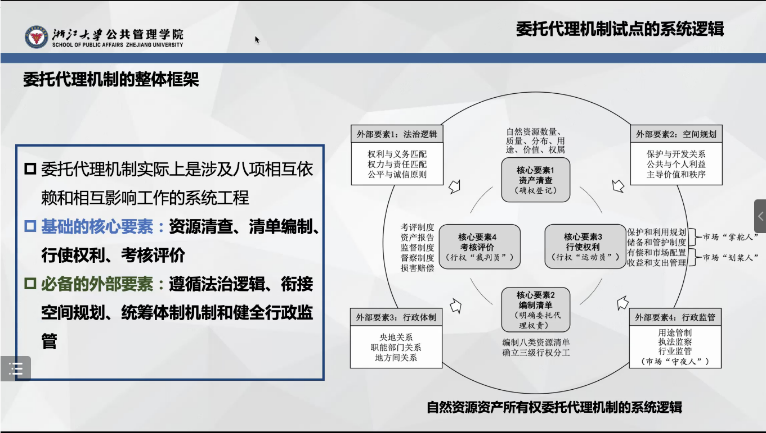 谭荣教授介绍了2013年-2022年间中国特色社会主义产权制度和治理结构的发展演变,阐明了全民所有自然资源资产所有权委托代理机制建立的政策背景,是对全民所有产权制度行权模式和自然资源资产管理体制的变革,以及对具有公权特征的民事权利关系的创新。讲座主要围绕全民所有自然资源资产所有权委托代理机制建立的根本原因、系统逻辑以及面临的困境与对策几个方面展开。首先,谭荣教授通过四个回应阐释为什么要建立委托代理机制。分别是回应公有制为什么行、回应自然资源整体性治理的诉求、回应区分“运动员”和“裁判员”难题、回应让市场在资源配置中起决定性作用,表明委托代理机制是公有制的行权模式,通过委托代理机制试点旨在合理划分中央和地方的责权利,调动地方行权的积极性;实现全民所有自然资源的整体性治理,保障利益公平共享和资源可持续利用,鼓励更多主体参与市场,深化市场机制改革。接下来,谭荣教授着眼于现行的自然资源管理体制机制,从资源清查、清单编制、行使权利、考核评价四项基础核心要素和遵循法治逻辑、衔接空间规划、统筹体制机制、健全行政监管四项必备的外部要素,构建了自然资源资产所有权委托代理机制的系统逻辑,具体阐释了各个要素的内涵以及这个系统逻辑的运行机理。最后,对试点面临的难题和当前应对状况进行分析,提出解决难题的关键策略,以及后续对委托代理机制试点研究的展望。