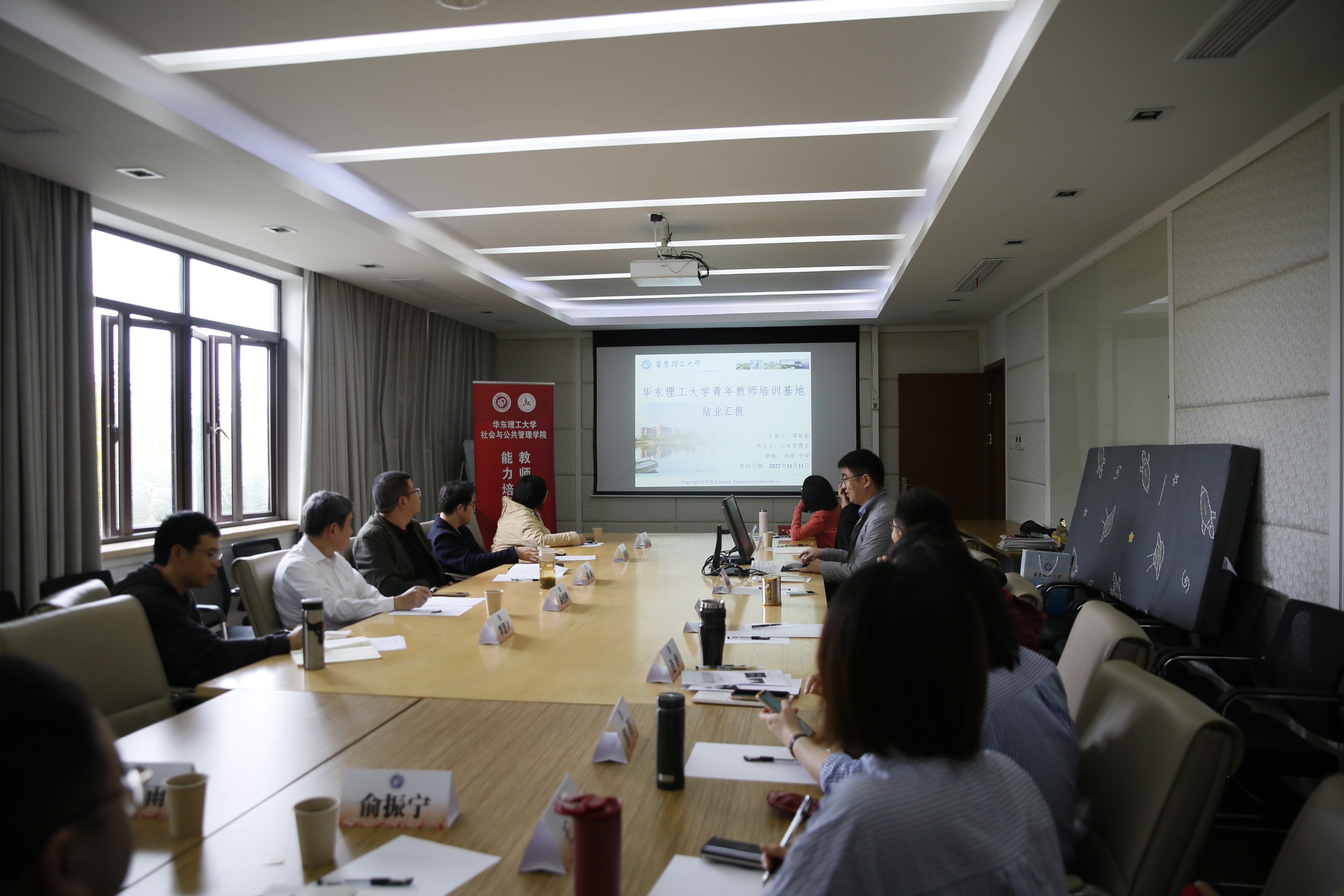 会议初始,结业青年教师通过精彩的PPT展示,生动的语言,结合党的二十大精神学习体会,展示了加入华理、参加基地培训以来获得的成长和感悟,对学校和学院给予的指导和帮助表达感谢。同时也对如何上好一门课给出自己的见解,提出了参与式教学、情景式教学、体验式教学、翻转课堂等多种教学方法,并根据学校、学院要求,结合督导建议、学生反馈等不断改进教学方法、设计合适的教学内容,在反复学习、改进的过程中不断提高教学水平。另外,也对教学过程中如何有效结合理论和实践、学生群体多样化如何平衡等表达了困惑。