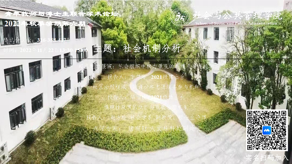 2022年11月22日下午13:30,由必赢76net线路官网主办的青年教师与博士生联合学术论坛2022年秋季学期第六期在线上举行,主题为“社会机制分析”。此次论坛由社会学系赵方杜老师主持,人文社科处副处长、社会学系唐有财教授担任点评专家,来自校内外的近50余名师生参加论坛。本次论坛主要由四位师生进行交流分享。