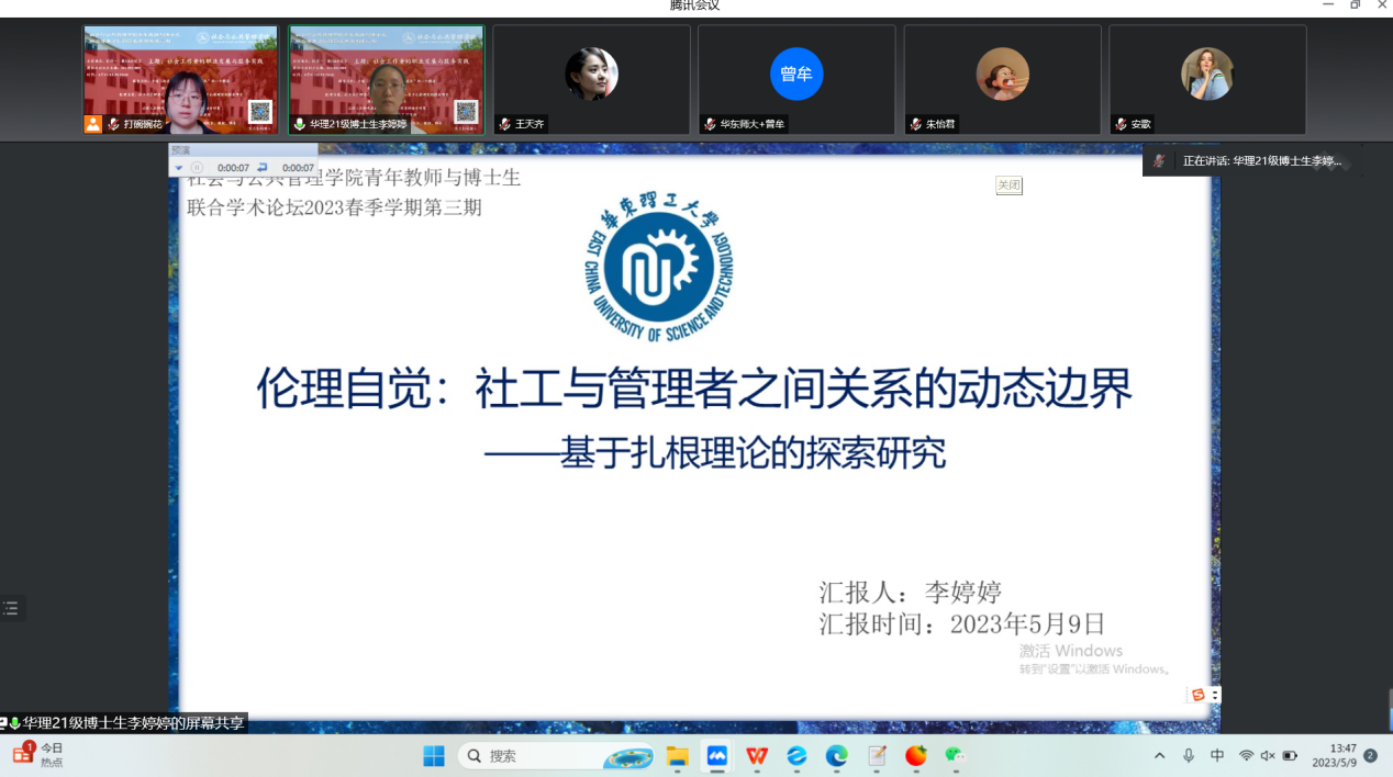 博士生李婷婷汇报的题目为《伦理自觉:社工与管理者之间关系的动态边界——基于扎根理论的探索研究》。报告首先指出了研究社工与管理者关系边界的现实意义。接着,基于对一线社会工作者及管理者的深度访谈以及文献资料,运用扎根理论建构了关系边界转换过程的理论模型,提出社工与管理者的关系边界属于工作-私人关系的边界,经历了边界感知、边界徘徊、边界整合与关系自觉的过程。最后,运用“伦理自觉”这一概念进行解释,提出关系边界是动态的,社工与管理者在边界的转换过程中,需要双方共同努力,根据具体情境采取合乎伦理的行动策略。