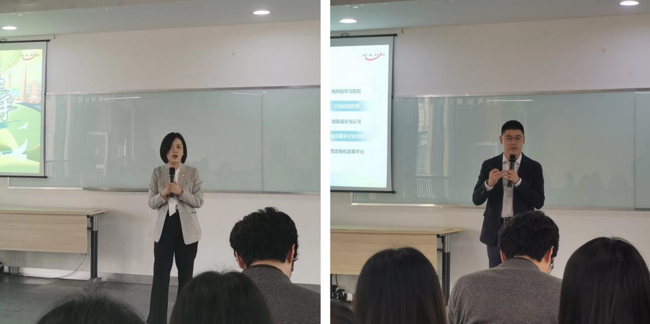 上海汉得信息技术股份有限公司于2011年在深圳证券交易所创业板上市,成为主营业务领域的首家A股上市公司,具有完备的校招新人培养体系,被誉为“IT咨询行业黄埔军校”。在交流中,万胤婕介绍了学院人才培养与就业发展情况,以23届第一位签约毕业生选择汉得为契机,积极拓展学习合作机会,期待与汉得更广泛深入的沟通交流。汉得信息HR运营总监郭少博向同学们介绍了行业情况、公司发展历程和就职体验,并与同学们就校招岗位、人才需求等问题进行互动交流。