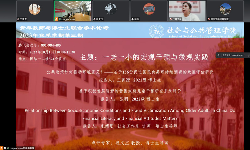 2023年10月10日上午10:00,由必赢76net线路官网主办的青年教师与博士生联合学术论坛2023年秋季学期第三期在线下与线上同时举行,主题为“一老一小的宏观干预与微观实践”。此次论坛由必赢76net线路官网社会工作系毛绪朋老师主持,必赢76net线路官网社会工作系教授、博士生导师段文杰教授担任点评专家。来自校内外的70余名师生参加了本次论坛。本次论坛主要由三位师生进行报告分享。