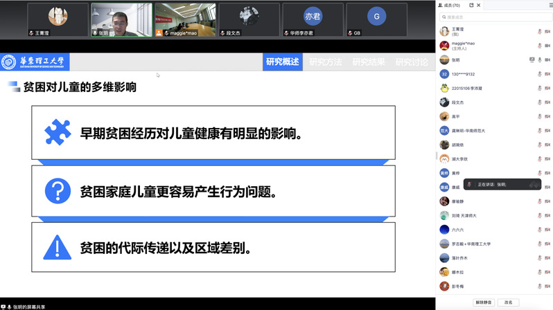 博士生张明汇报的题目为《基于积极发展资源的贫困家庭儿童干预研究系统评价》。该报告基于贫困对儿童有多维影响的现实,梳理了儿童和青少年研究从问题视角向积极视角的转变。讲者结合社会资本理论和积极发展资源模型,建构了社会资本视角下的贫困家庭儿童积极发展资源框架。通过数据库检索基于积极发展资源的贫困家庭儿童干预研究文献,对符合纳入标准的13篇文献分析发现,家庭、学校、社区(村庄)是贫困家庭儿童积极发展的重要场域;针对儿童、父母、教师实施干预均能促进贫困家庭儿童的认知、结构、横向积极发展资源。但研究也同时显示,贫困家庭儿童干预研究质量有待提升、以纵向积极发展资源为干预目标的研究缺失。