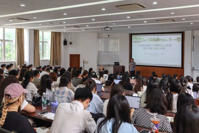 本次主讲题目为《机构系统重构下我国社会工作的聚合发展与统合发展》。王教授主要从“中国式现代化的新进程及其战略任务、新时期中央加强社会治理的战略部署及对社会工作的要求、社会工作部组建和系统建设过程中社会工作的聚合与统合、党的社会工作部门建构中的聚合及结合性建构、机构重组下社会工作的统合发展、专业社会工作在党的社会工作统合中的能动作用”六个方面进行了系统讲解。王教授站在中国式现代化进程以及中央社会工作部组建的大背景下,从学术的角度提出了聚合、统合理论对我国“大社会工作”发展的新解释,即聚合是部分责任相似者或各部门转隶而形成的状态,是一个组织结构的概念,任何大的、复杂组织的形成都有聚合过程,是一种有分工的部门聚集,由转隶而形成的组织,其“聚合态”更加明显;统合则指的是上下级之间、权威部门与所管辖组织(部门)间的既“统”又“合”的关系。